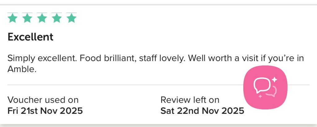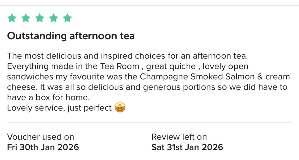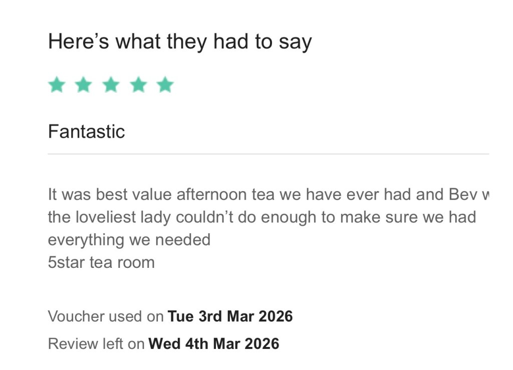 We popped in here after a boat trip and it was the perfect end to our holiday in Northumberland. We sat upstairs and it is beautifully decorated with inspiring quotes and references to children’s stories. We ordered 2 of the high teas, amongst other things. I enjoyed a coronation chicken sandwich and a wonderfully baked scone, while sipping on my tea and nibbling on salad and crisps. Would definitely return, it was lovely.